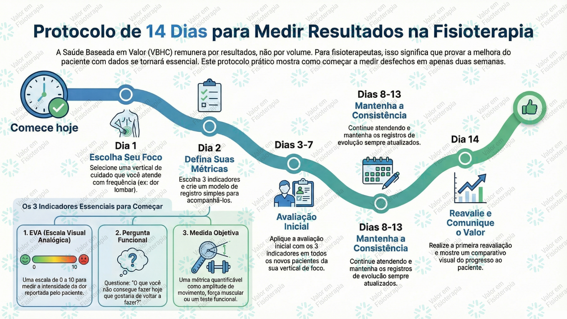 Dia 1: Escolha uma vertical de cuidado. Recomendo começar pela mais frequente na sua agenda (ex: dor lombar, ombro, joelho).